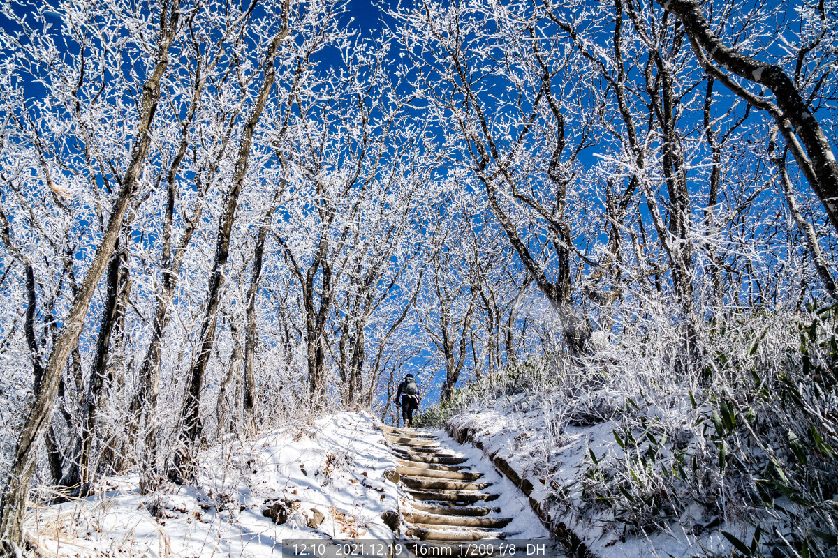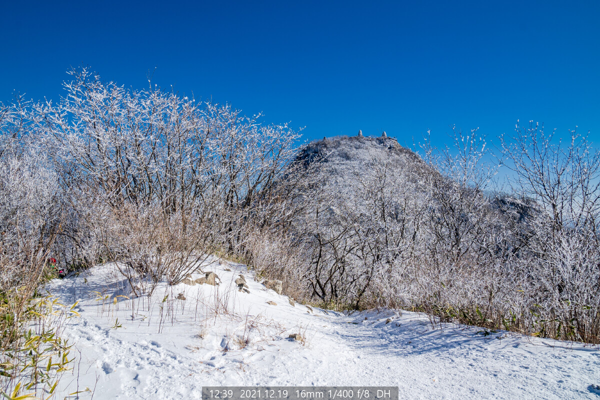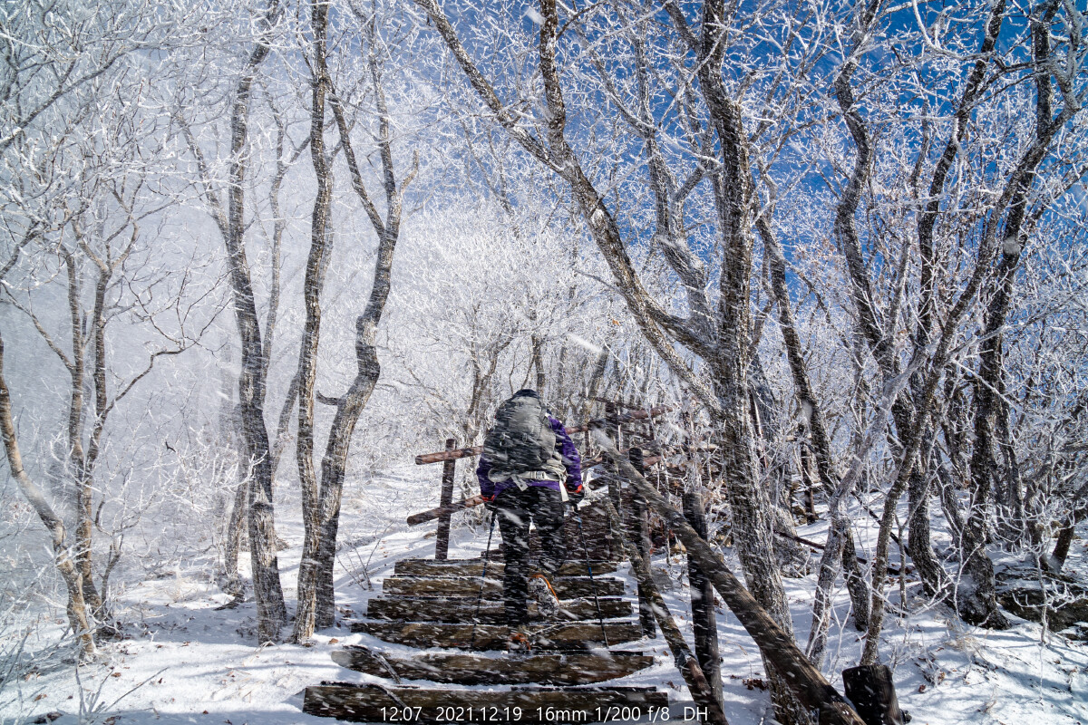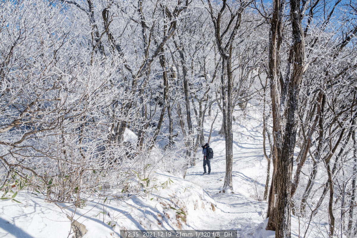 능선에는 하얀 상고대가 아직도 한창이다. 마음이 급해진다. 상고대가 햇볕에 녹거나 바람에 떨어지기 전에 능선에 올라야 한다.