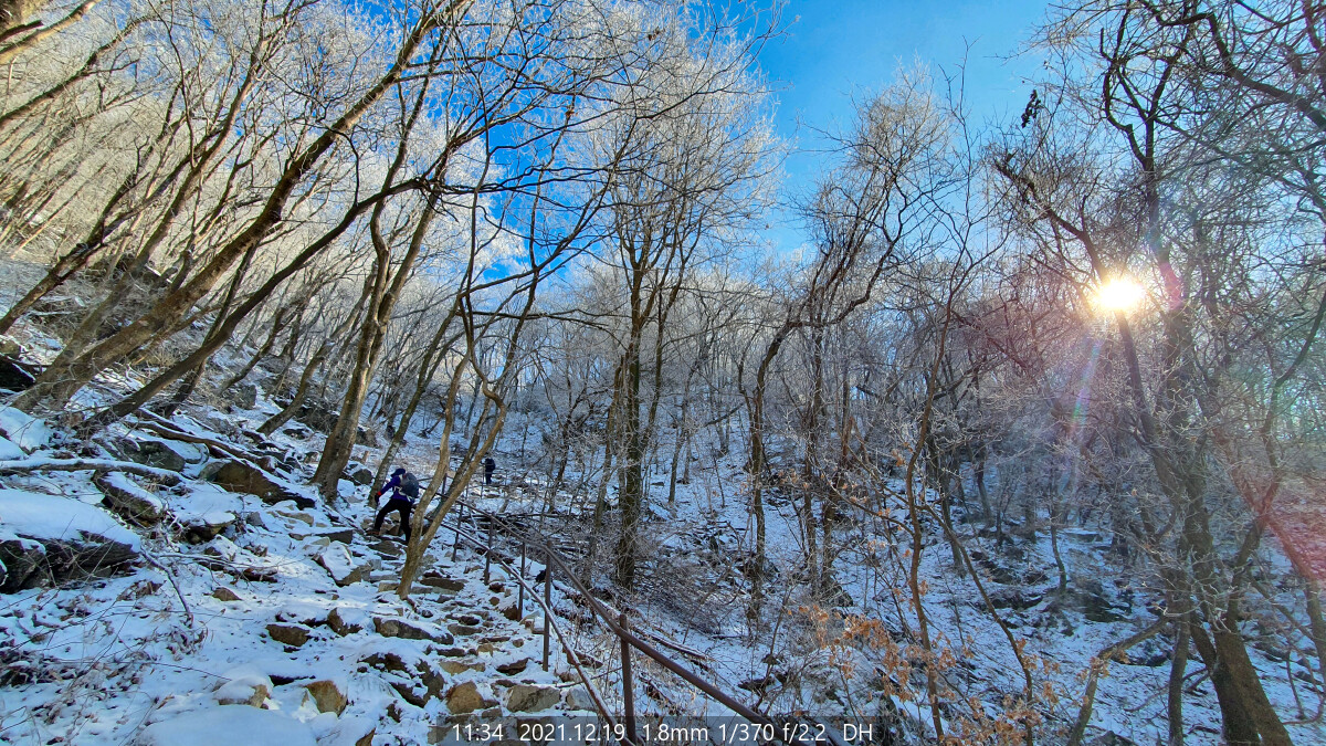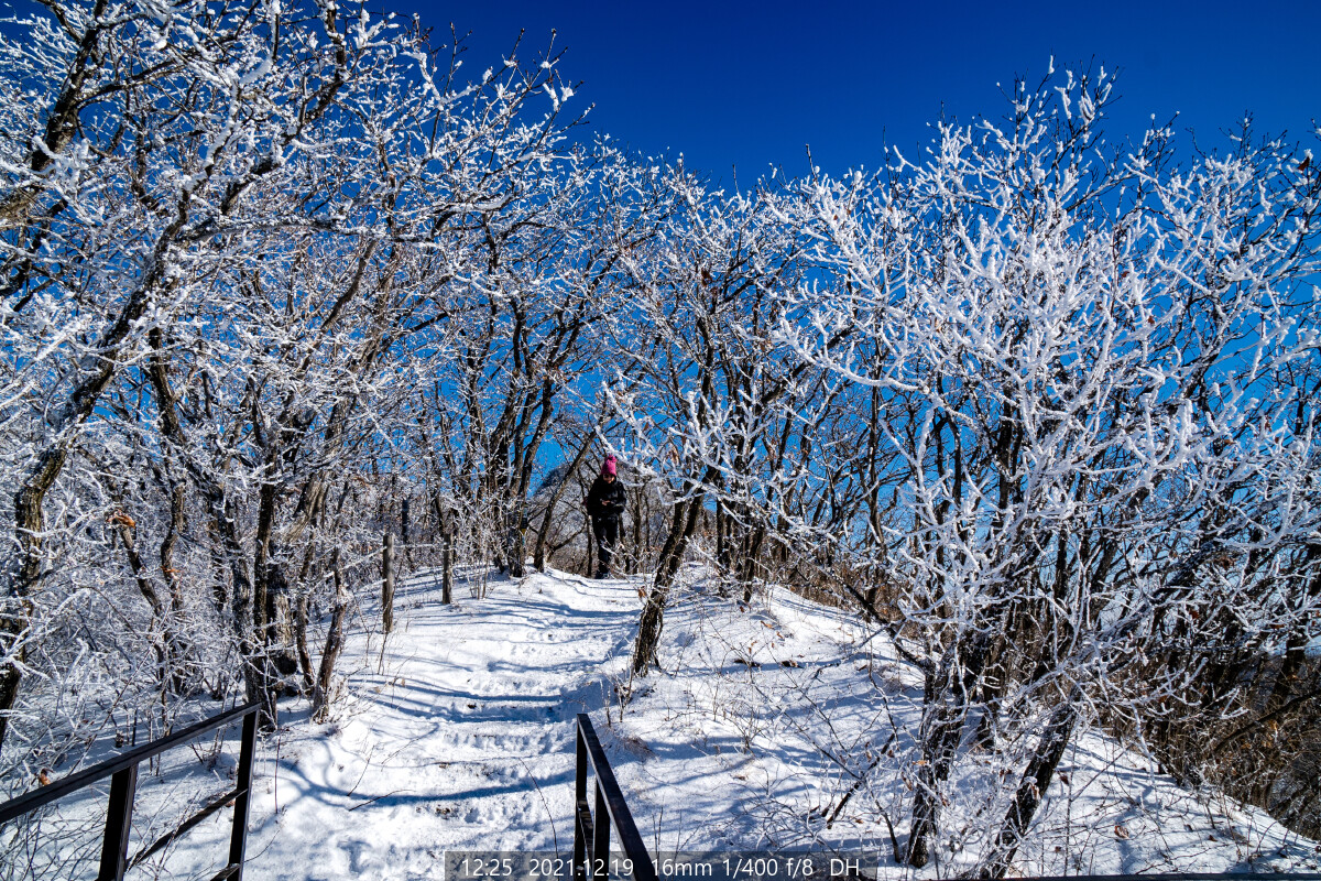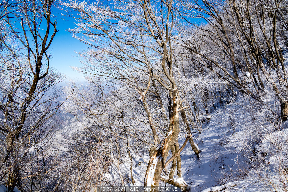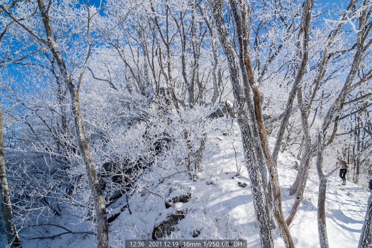 능선에는 하얀 상고대가 아직도 한창이다. 마음이 급해진다. 상고대가 햇볕에 녹거나 바람에 떨어지기 전에 능선에 올라야 한다.