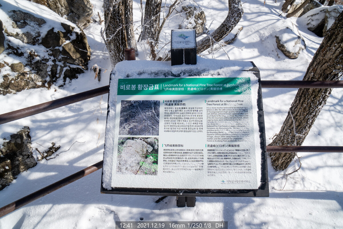 '황장금표(黃腸禁標)'는 황장목(질 좋은 금강송) 보호를 위하여 일반인의 무단 벌목을 금지한다는 내용의 방(榜)이다. 치악산에는 3개가 있는데, 구룡사와 새재 마을 입구, 그리고 여기 비로봉 가는 길에 있다.
