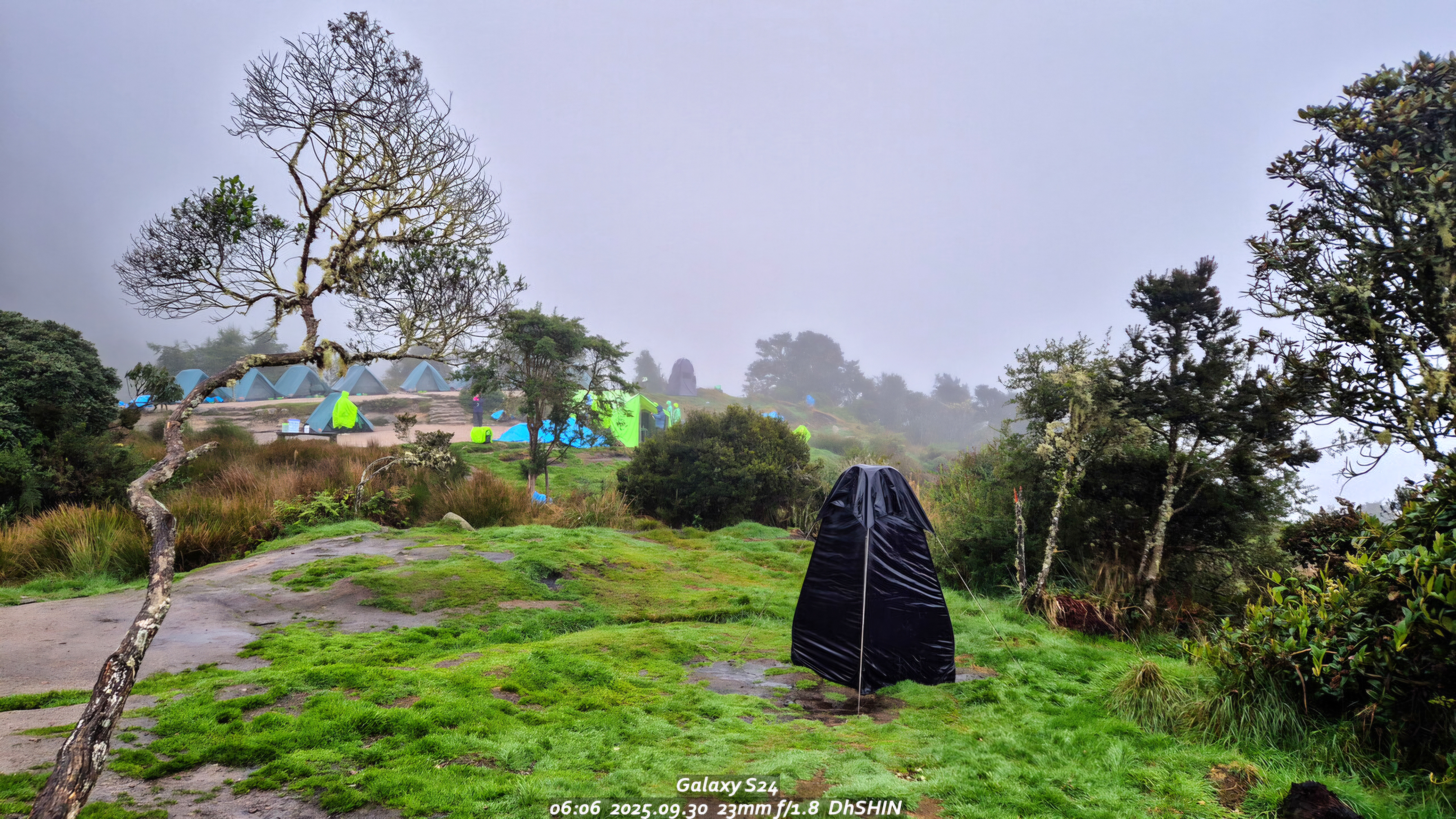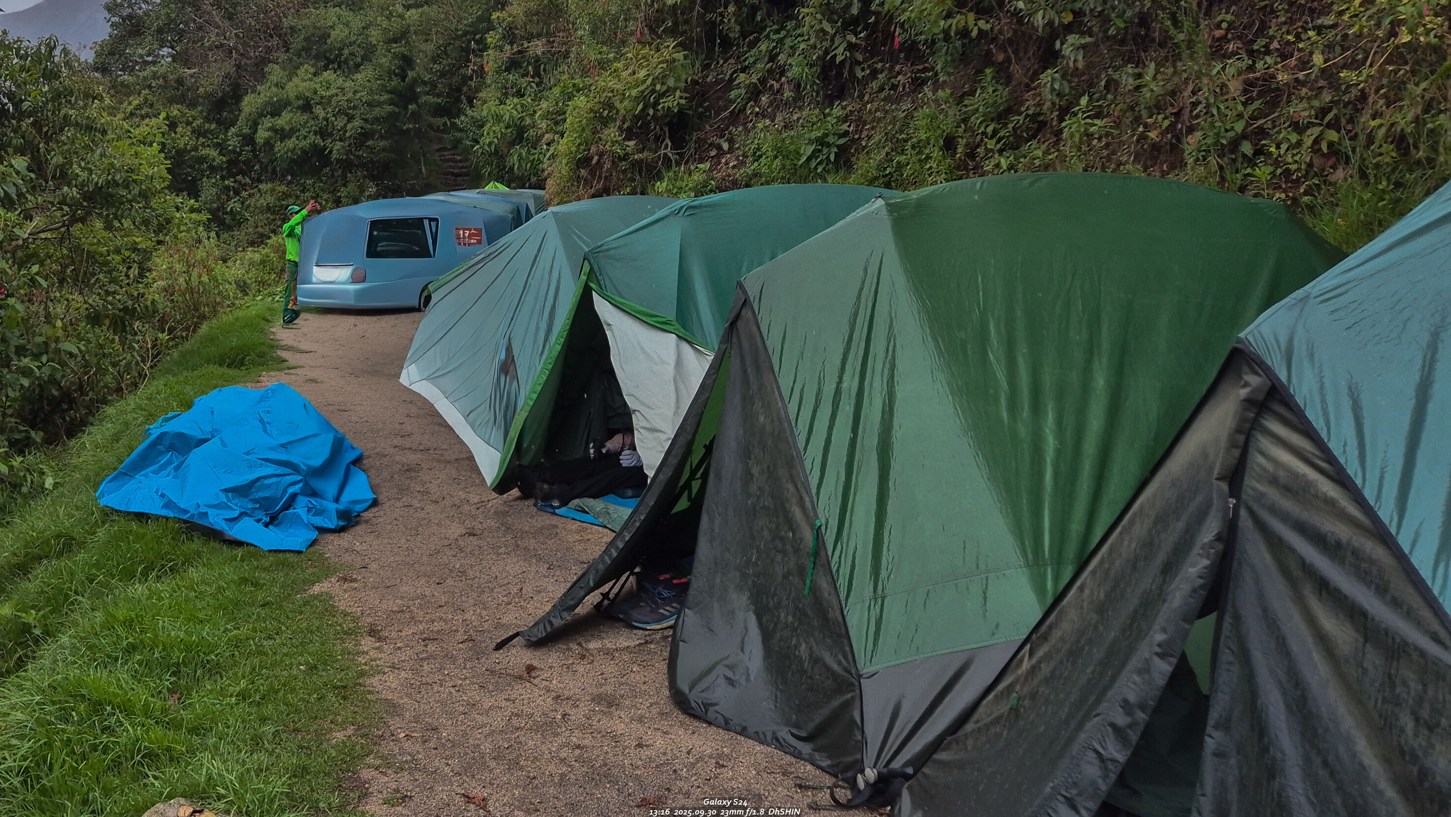 오늘은 한 번의 고개로 쉬운 날인데, 새벽부터 비가 쏟아지며 천둥번개가 요란하다. 2시 20분에 깨서 천둥소리 들으며 비몽사몽. 산소포화도는 96%, 양호하다. 검은 텐트가 화장실이다. 화장실이 없는 야영장에선 구멍을 파고 저런 임시 화장실을 만드는데, 여긴 텐트 안에 이동식 변기를 놓는다. 용변이 끝나면 숲 속에서 지켜보던 잡부가 고무장갑을 끼고 깨끗이 치운다. 민망한 아내는 팁을 준다.