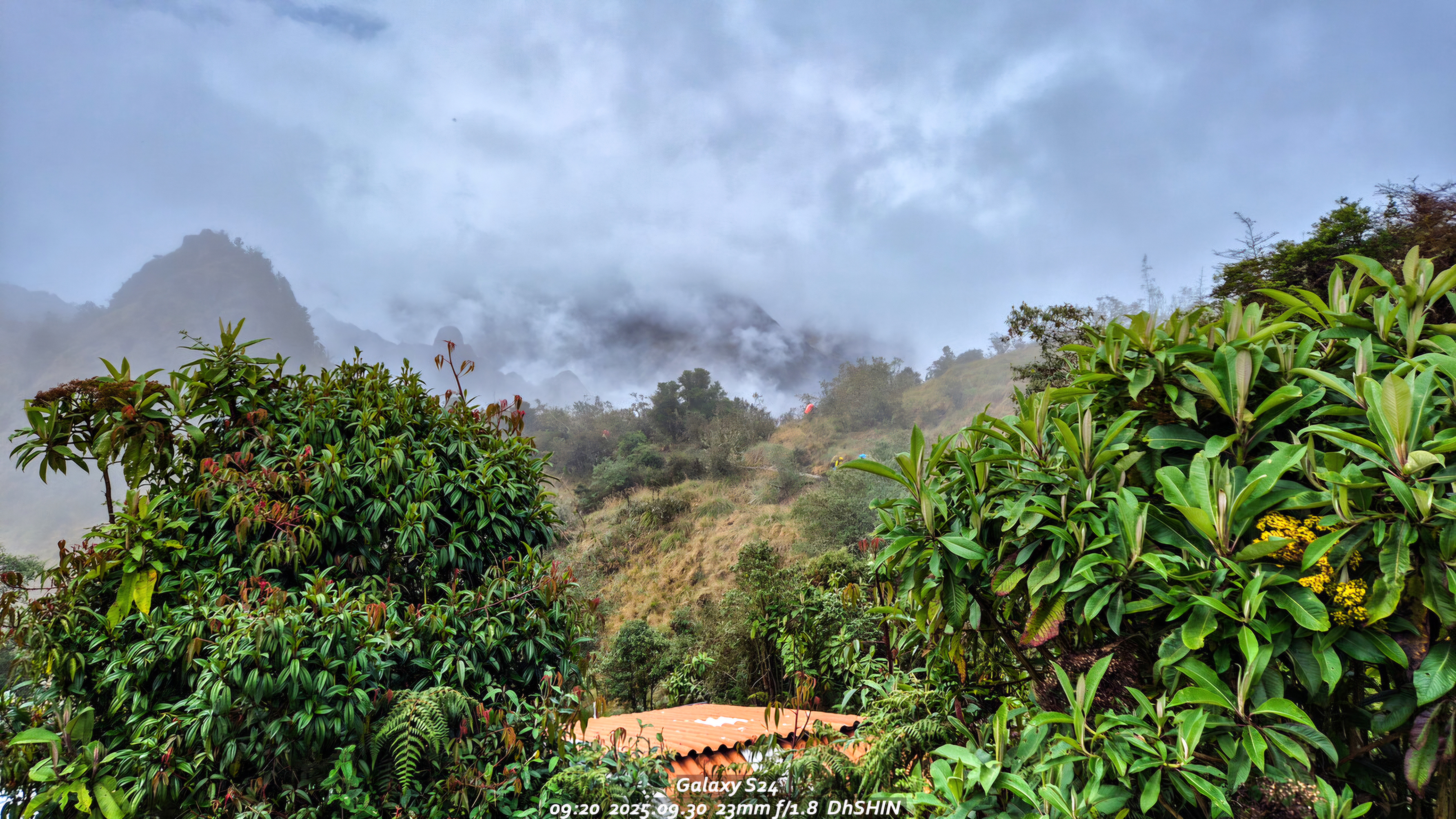 출발 무렵에 다시 비가 내렸다. 방수 자켓, 우비, 방수 장갑, 내피로 단단히 무장했다. 중간쯤 올랐을 때 비가 멈추면서, 구름이 둥실둥실 떠다니며 기가 막힌 풍경을 보여준다. 돌길을 따라 오르니 땀이 흘러, 잠시 쉬면서 겉옷을 전부 벗는다.